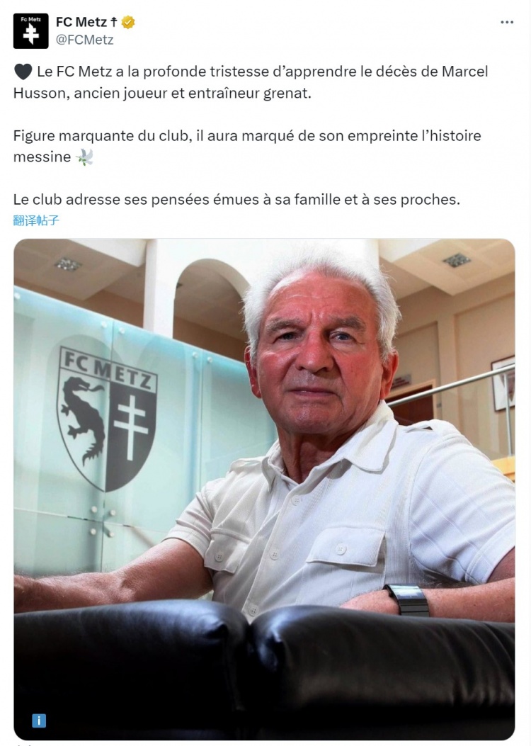 R.I.P.梅斯前主帅马塞尔-胡森示寂,俱乐部官方社媒发文默哀