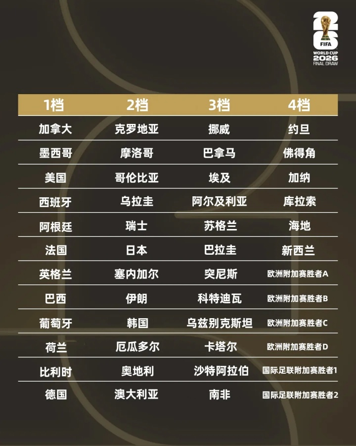 第一档:加拿大、墨西哥、好意思国、西班牙、阿根廷、法国、英格兰、巴西、葡萄牙、荷兰、比利时、德国