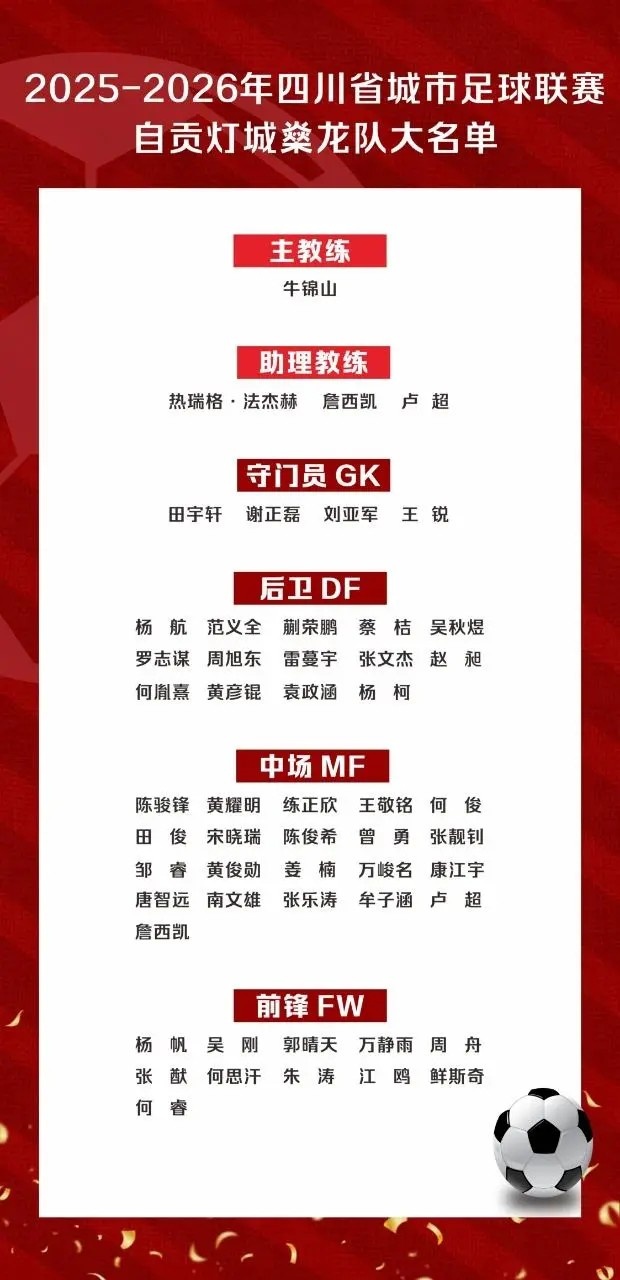“川超”自贡队50东说念主大名单出炉:成都体育学院教养牛锦山挂帅