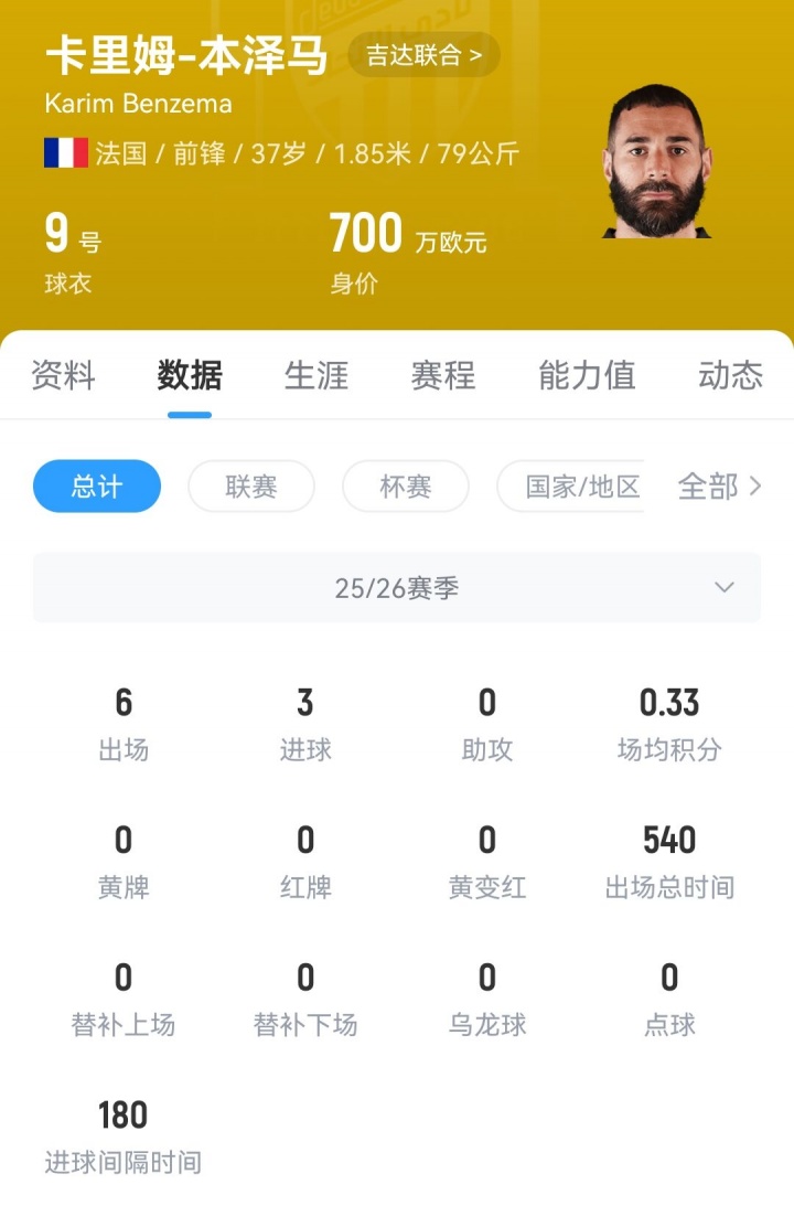 看成吉达聚合头牌,37岁的本泽马本赛季情状灾祸,除了在联赛首轮对阵阿科多时戴帽,本泽马其余比赛均未参与进球,本泽马本赛季因伤病等原因缺席了5场比赛,而在他干与的6场比赛中,吉达聚合1胜1平4负。