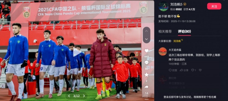 2025年熊猫杯落下帷幕,U22国足1胜1平1负获取亚军,算作球队队长,刘浩帆三场比赛沿途首发且打满270分钟。今天,刘浩帆发文追念熊猫杯,他写说念:胜不骄 败不馁。