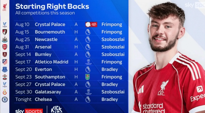 此役布拉德利担任利物浦首发右后卫,据天外体育统计,本赛季利物浦莫得任何右后卫操办4场首发。