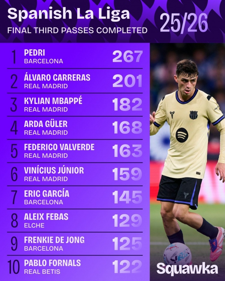 10月7日讯 日前,Squawka统计了本赛季西甲迫切三区传球次数排名,佩德里267次居首,5名皇马球员进前十。