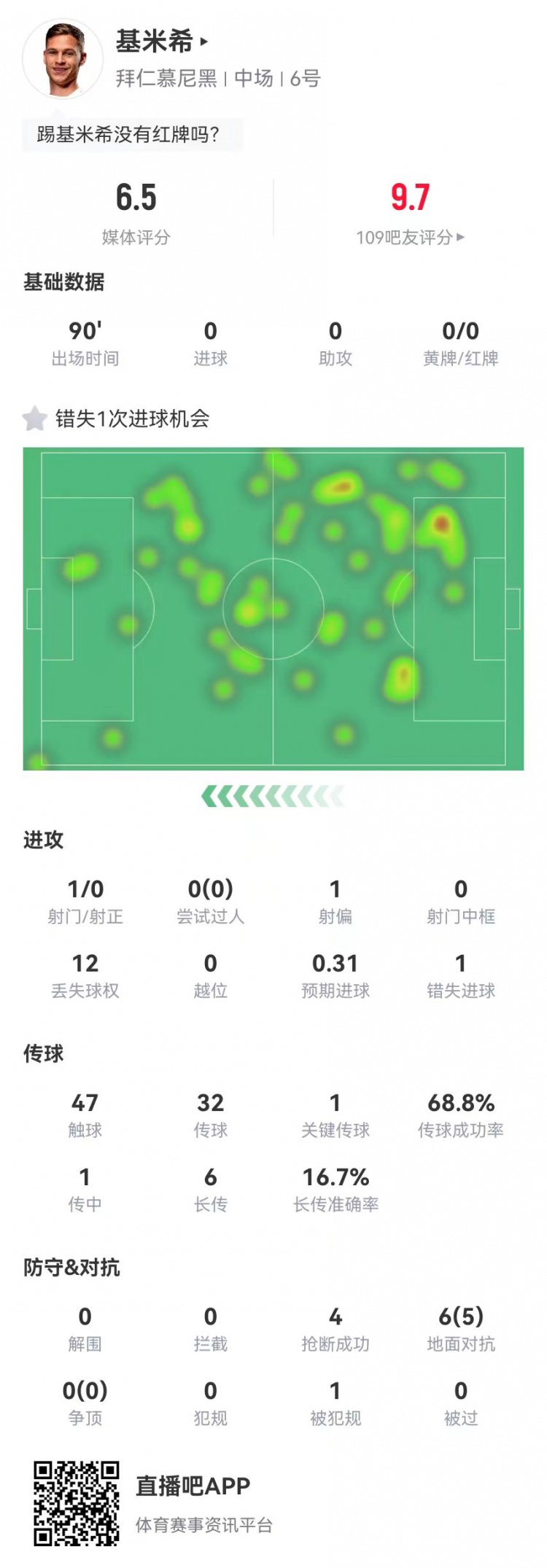 基米希本场1射1失良机+1关节传球 4抢断+6抗击5成效 仅获6.5分