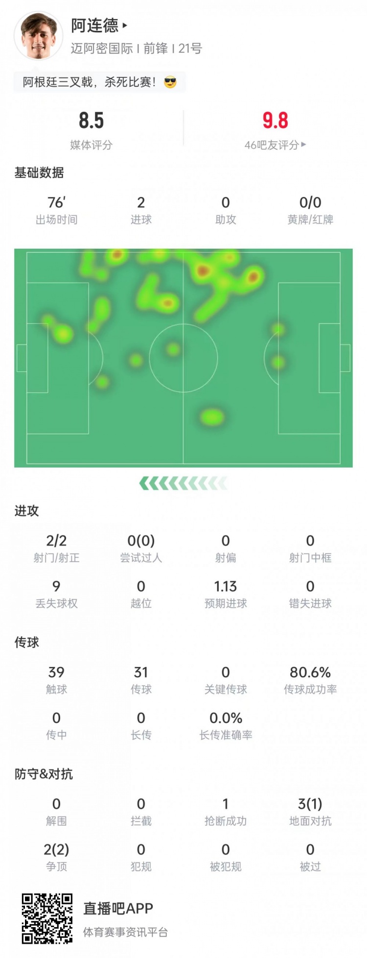 阿连德本场数据:2次射门打进2球,5次顽抗3次告捷,获评8.5分