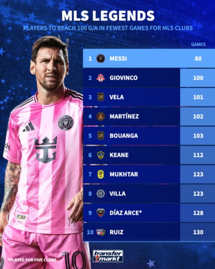 好意思职联球员参与百球场次名次:梅西80场最快,第二乔文科100场