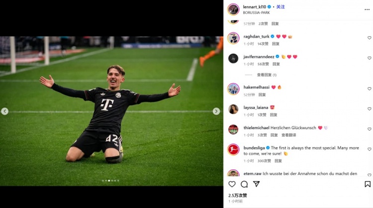 他也在赛后通过社媒晒出我方的滑跪庆祝照,并未附加笔墨实践,仅仅艾特了德甲联赛官方账号,并附上“👋👋#42 #进球 #得胜”等颜料和标签。