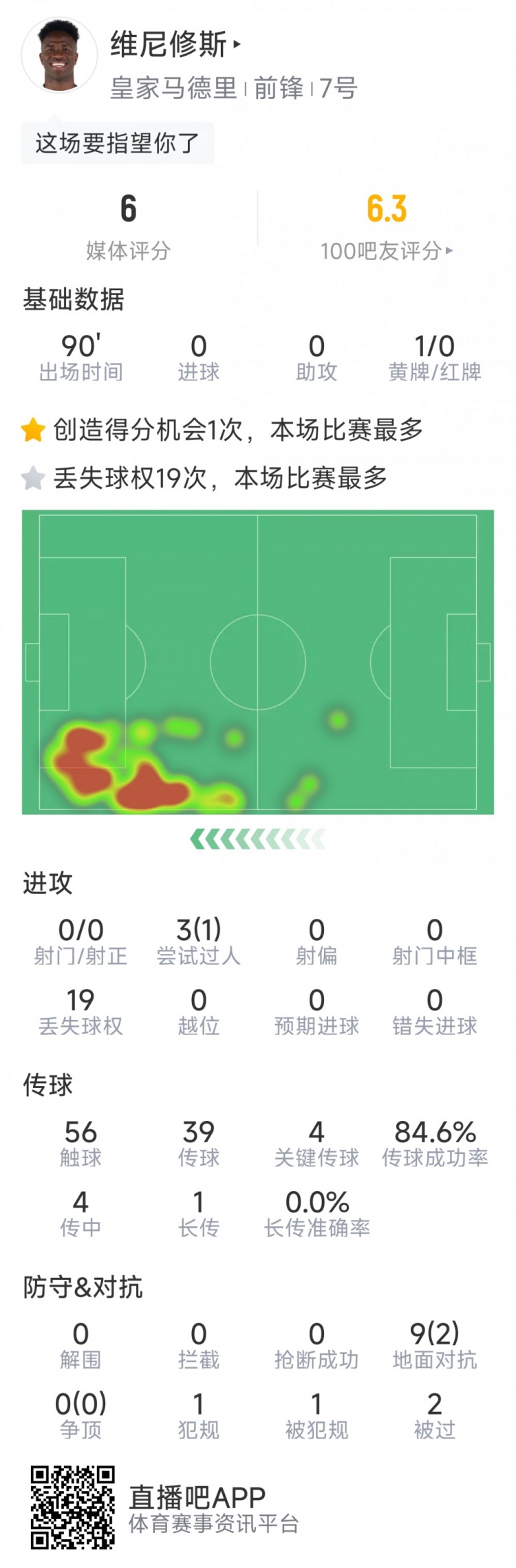 维尼修斯本场数据:0射门,4次要害传球,9次抵抗仅2次告捷