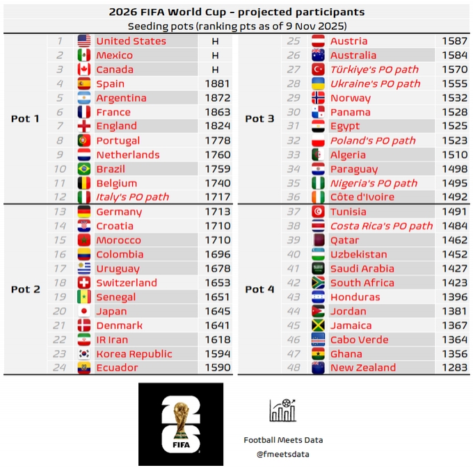 11月09日讯 据外媒Football Meets Data报说念,外洋足联(FIFA)将调动通过附加赛晋级2026年寰球杯的球队分档原则!