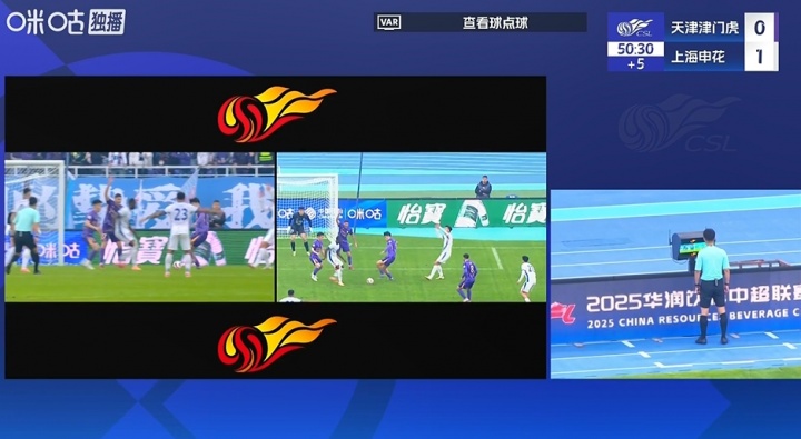 上半场补时阶段,王献钧禁区内手球,裁判经VAR请示后回看改判点球,吴曦点射破门,申花2-0超越津门虎。