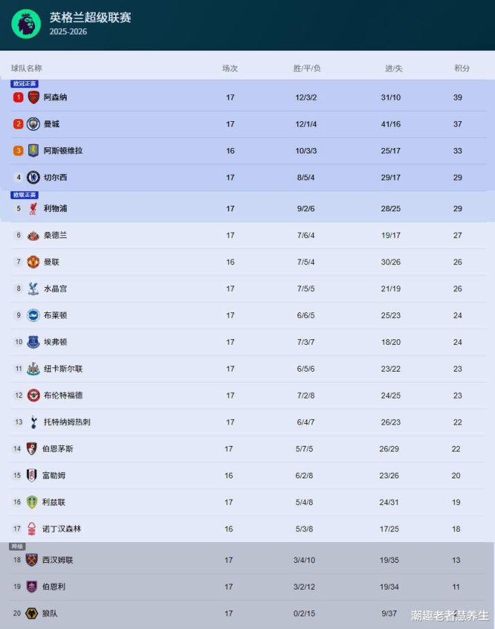积分榜因此发生要津变动:曼城以37分反超登顶,少赛一轮的阿森纳以1分之差跌落至第二位,争冠主动权果决旁落。阿斯顿维拉33分位列第三,切尔西得益一分后暂居第四。