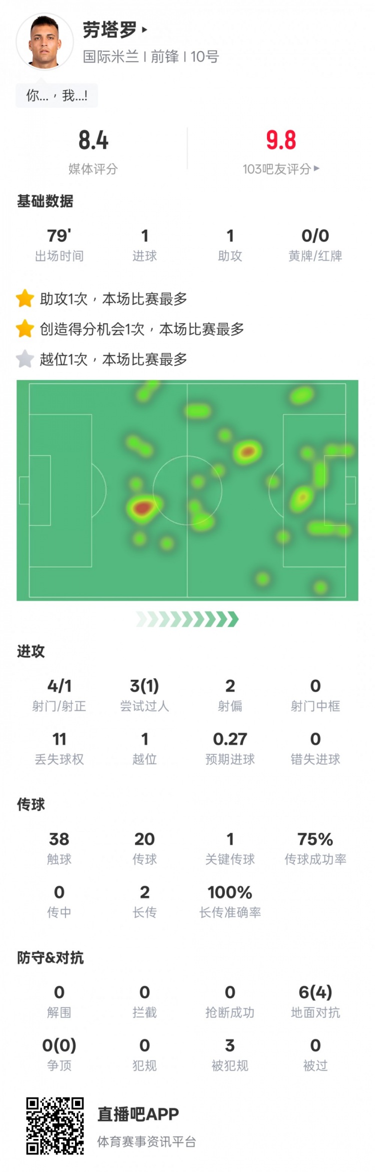 劳塔罗本场数据:1进球1助攻1纰谬传球,评分8.4