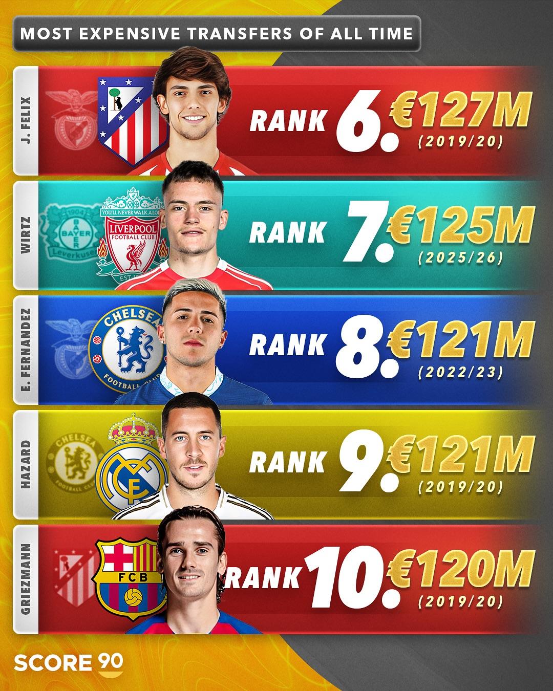 6、费利克斯,马德里竞技,1.27亿欧