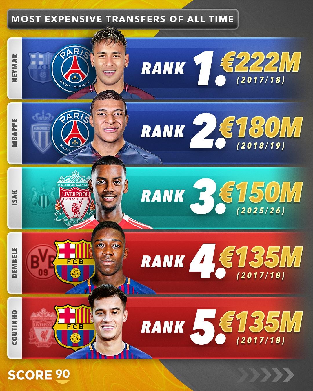淌若转会敲定,那么伊萨克将成为足坛历史转会身价第三高的球员: