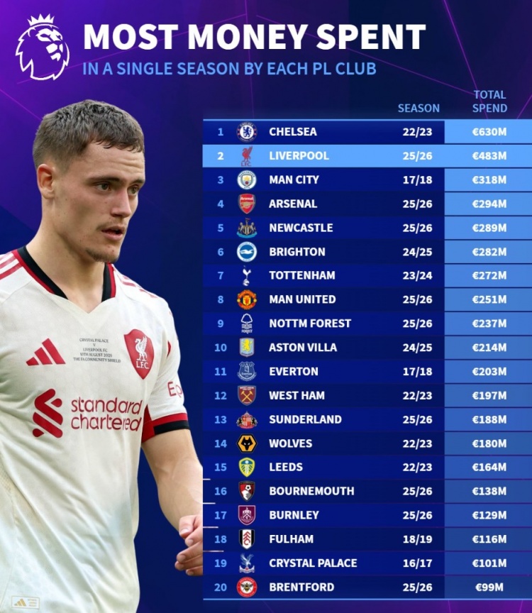 英超各队单赛季最高支拨:蓝军22-23赛季6.30亿 利物浦今夏4.83亿