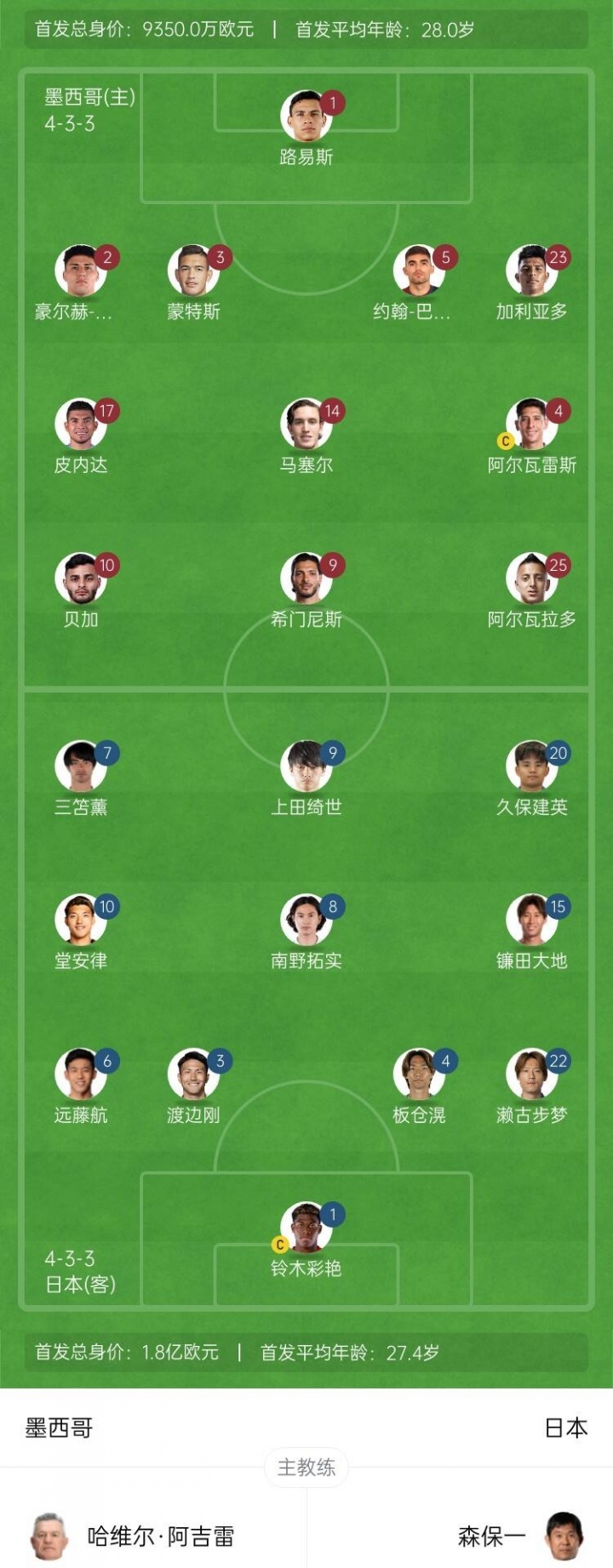 当天日本对阵全国名次高我方4名的墨西哥,两队势均力敌,合手手言和。日本队这场比赛全主力首发,队内球星包括利物浦的远藤航、布莱顿的三笘薰、皇家社会的久保建英、摩纳哥的南野拓实、法兰克福的堂安律等一众名将,首发身价1.8亿欧是墨西哥的2倍。