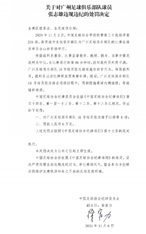 而在这个赛季的收官战中,张志雄再次引起事端。由于对判罚不悦,张志雄作念出诅咒裁判的动作,并在退场经过中蹬踹通说念墙体,过后被中国足协搞定停赛6场并罚金6万元东说念主民币。