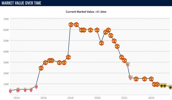 在2015年,19岁的马夏尔曾以6000万欧元转会费加盟曼联,并在往日赢得欧洲金童奖。在2018年,马夏尔的德回身价达到生计巅峰,高达6500万欧元。这位法国先锋在曼结伴计代表球队出场317次,孝敬90球54助。随后在昨年夏天离开老特拉福德,但在雅典AEK,球员也莫得找回现象。