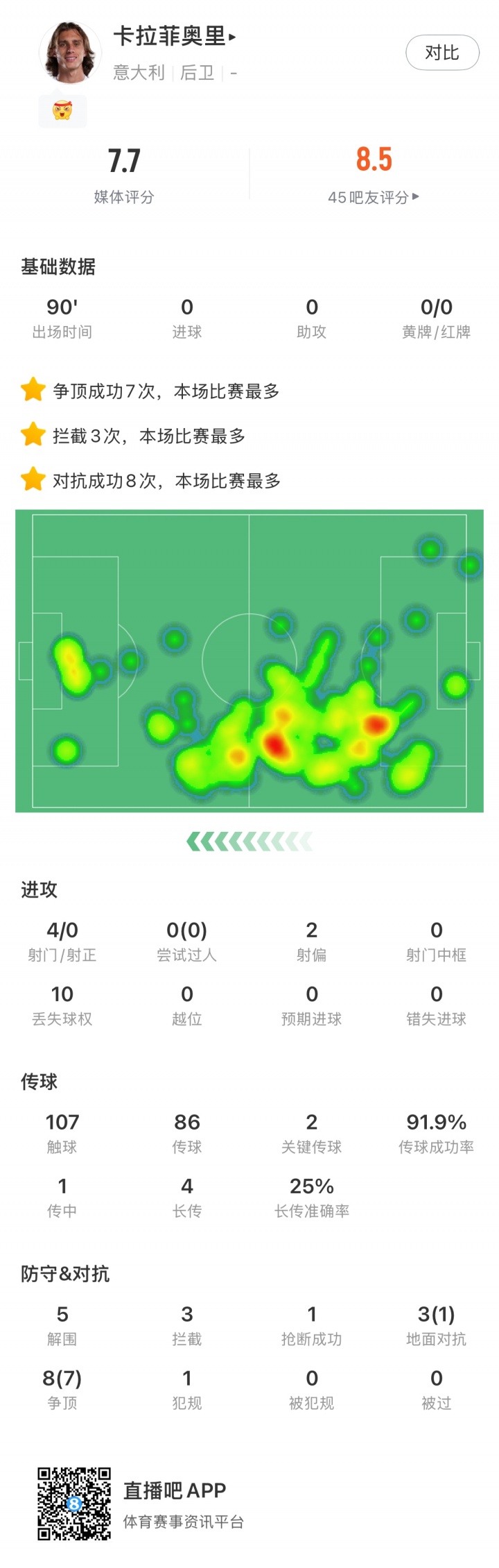 卡拉菲奥里珍强大利踢左中卫,热区遍布前中后,顽抗防患传球兼顾