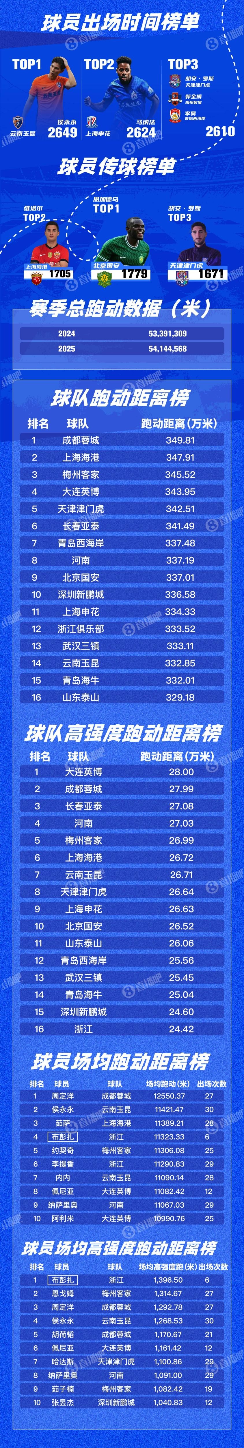 全赛季16支球队总跑动距离,客岁是52746531米,本年是53827364米,增多2.05%。闲居,毕竟这个赛季场均补时长到令东说念主发指。