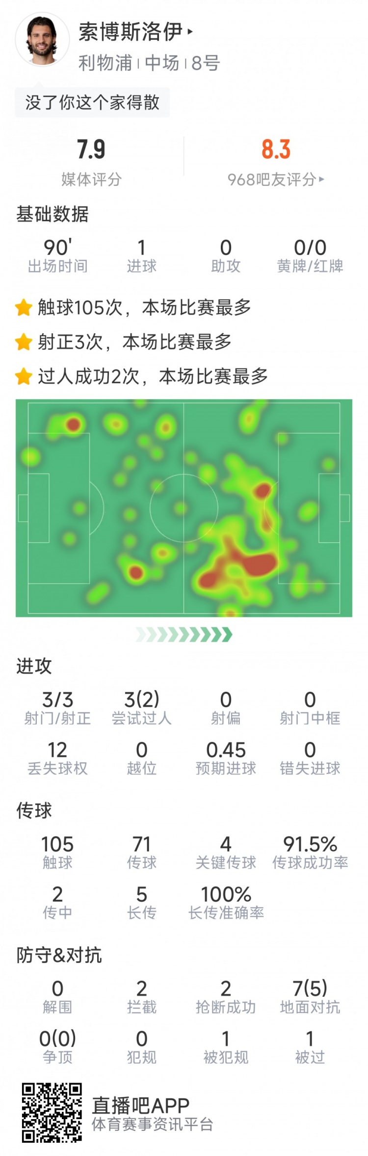 唯独靠谱,索博本场数据:1进球,4要道传球,评分7.9分全队最高