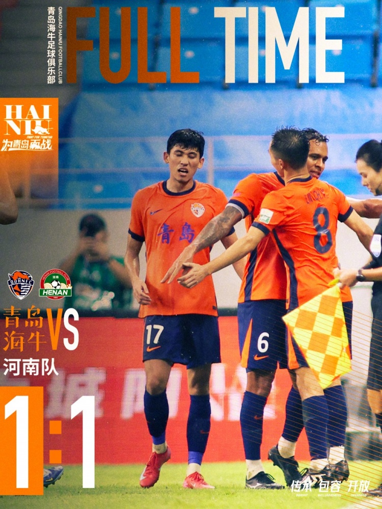 全场比赛甩手,青岛海牛1-1战平河南队,林创益为球队打入一球。